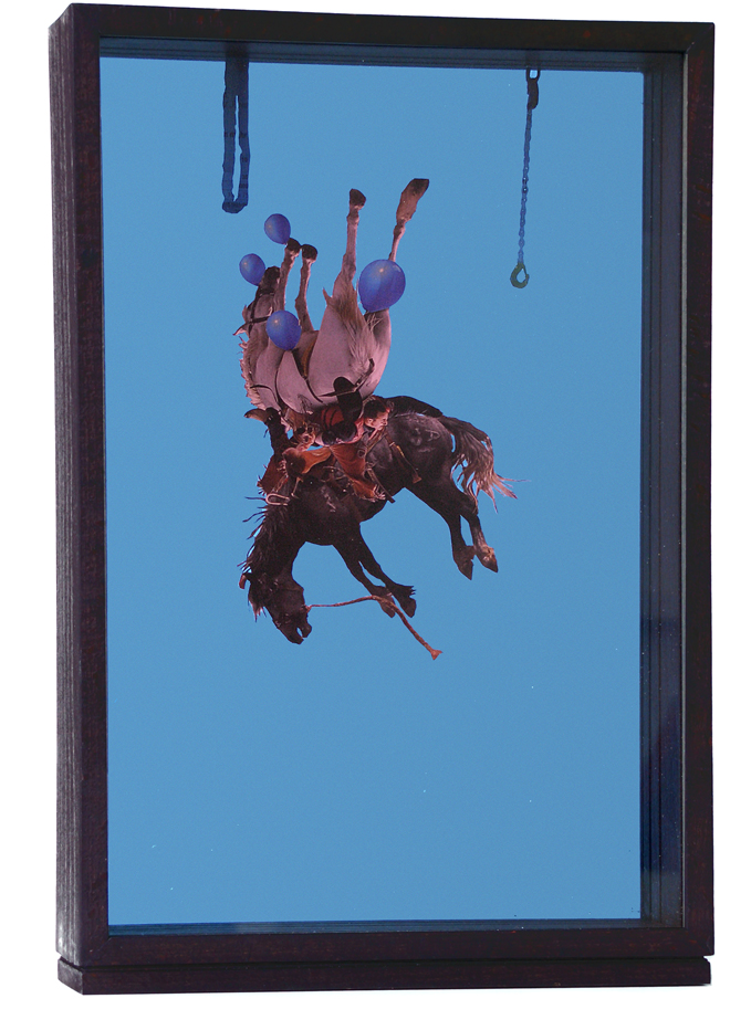 Collage of newsprint and bookprint on tinted glass, wood